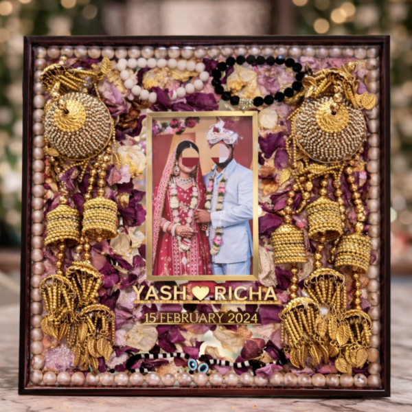 Along with your original varmala and kalire, we also preserve extra items like wrist bands, bangles, pearls, or any meaningful accessories inside the frame. Combined with your photo, names, and wedding date, this frame becomes a complete story of your wedding.