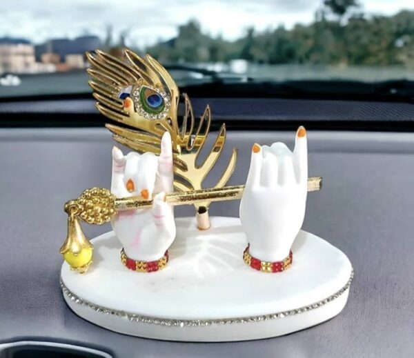 Unique Marble Krishna Hand Showpiece – Elegant dashboard décor featuring Lord Krishna’s divine hands holding a flute. Crafted with a premium marble base and golden detailing, it adds a spiritual and luxurious touch to your car or home.