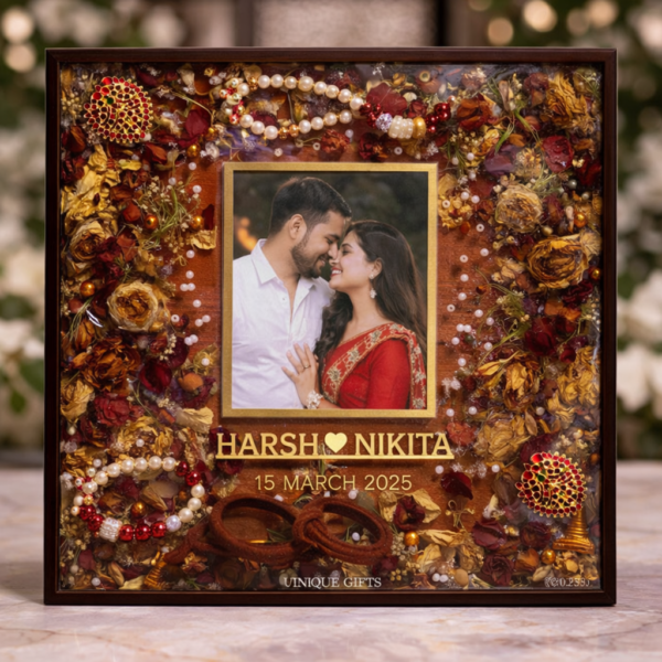 Preserve your wedding varmala, jewellery, and special memories in a luxurious handcrafted resin frame by Unique — a complete keepsake of your big day.