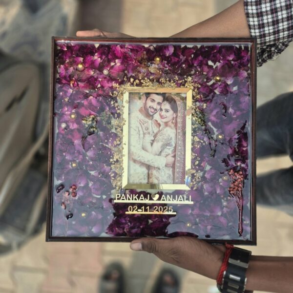 Preserve your special memories with this premium handcrafted resin frame by Unique. Decorated with real dried petals, golden flakes, and customized photo & name engraving — a perfect gift for weddings, anniversaries, and special occasions.